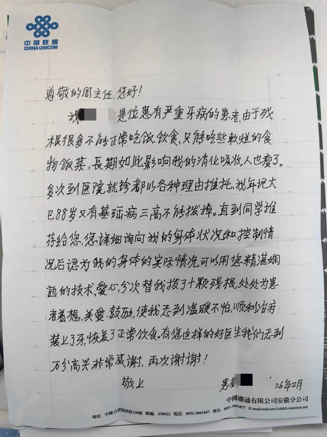 近日,一封来自88岁患者的手写感谢信,被送到了安徽医科大学附属口腔医院(安徽省口腔医院)望湖城门诊部。信中,老人深情感谢门诊部负责人周允芝为他拔除了困扰多年的10颗牙残根,使其在耄耋之年重获正常咀嚼能力,改善了生活质量。